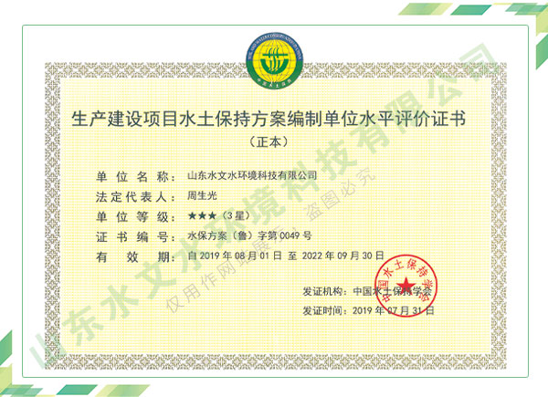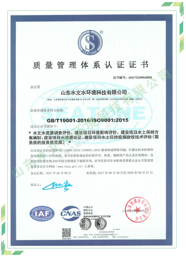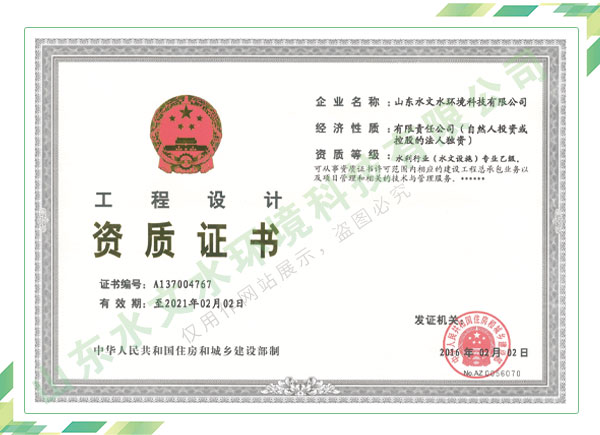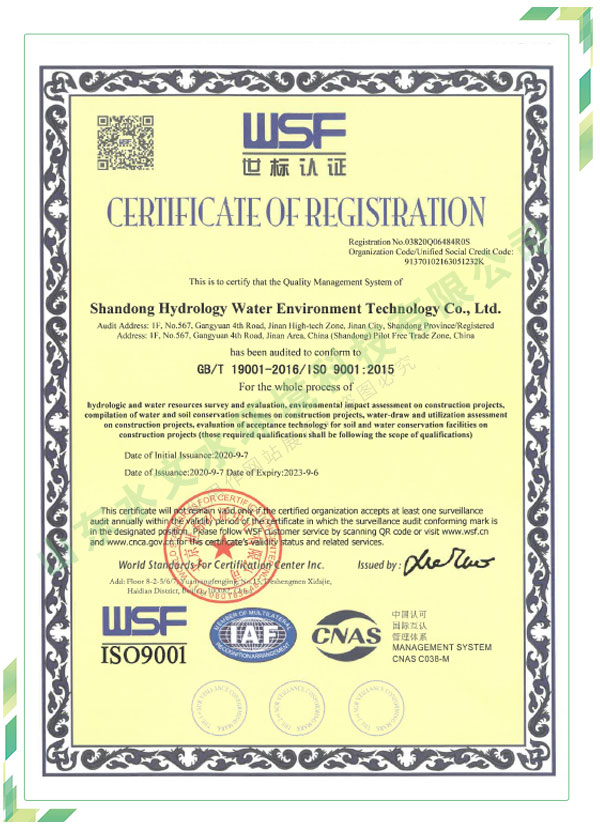 公司擁有水利工程設(shè)計、水土保持、水文水資源調(diào)查評價、水資源論證、建設(shè)項目環(huán)境影響評價、市政公用工程施工總承包、水利水電工程施工總承包、電子與智能化工程專業(yè)承包等資質(zhì),2017年通過質(zhì)量管理體系、環(huán)境管理體系、職業(yè)健康安全管理體系認證;2020年被評為國家級高新技術(shù)企業(yè),同年被中國水利企業(yè)協(xié)會推薦為第一批“合同節(jié)水服務(wù)企業(yè)”;2021年被山東省、濟南市評為 “專精特新”中小企業(yè)。業(yè)務(wù)范圍涉及水利工程設(shè)計;節(jié)水設(shè)計、改造、水平衡測試;山洪災害調(diào)查;城市水資源調(diào)查評價;建設(shè)項目水土保持方案編制、監(jiān)測、驗收、水土保持規(guī)劃;水安全保障規(guī)劃、建設(shè)項目水資源論證、規(guī)劃水資源論證;建設(shè)項目環(huán)境影響評價;入河排污口論證;防洪影響評價;市政公用工程施工、水利水電工程施工、電子與智能化工程施工等。